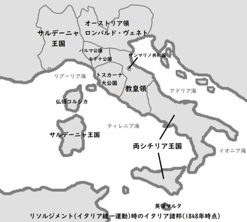 ■イタリア諸邦、夢の連合艦隊! 1848年時点のイタリア諸邦の地図。イタリア北東部のロンバルディア地方(中心都市はミラノ)とヴェネト地方(中心都市はヴェネツィア)はオーストリア支配下にあった。アドリア海における海軍作戦に艦隊を派遣したのはイタリア北…